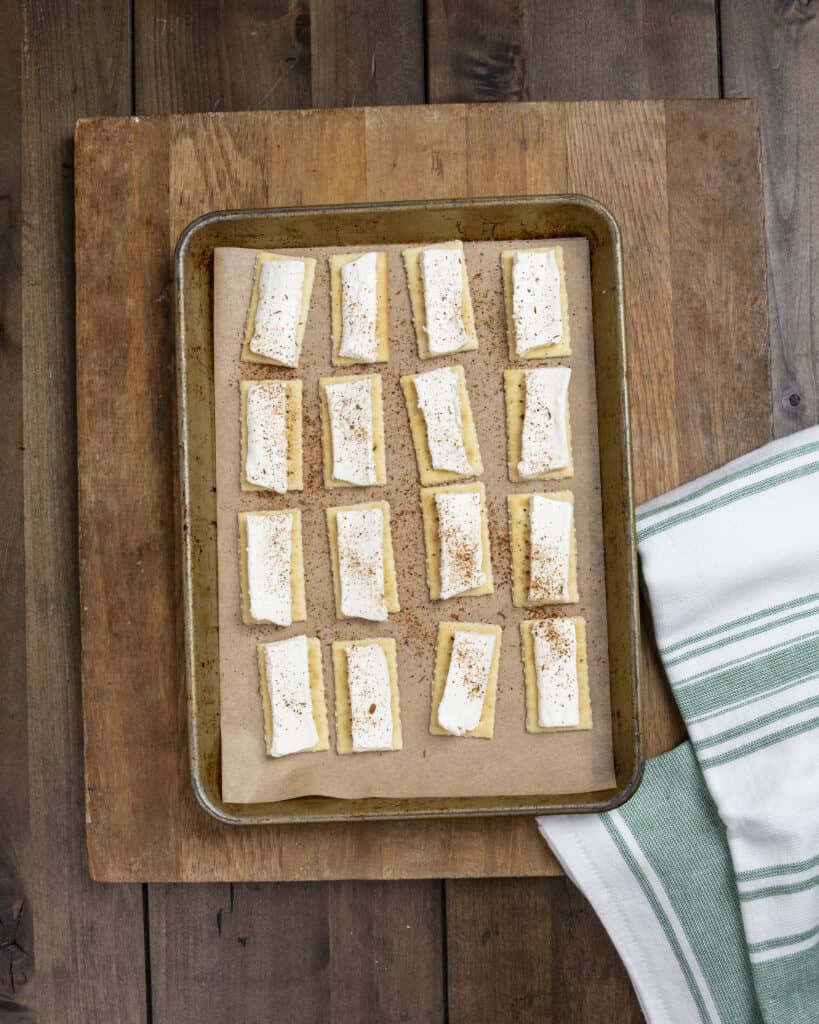 - Lay club crackers onto a baking sheet lined with parchment paper for easy clean up.