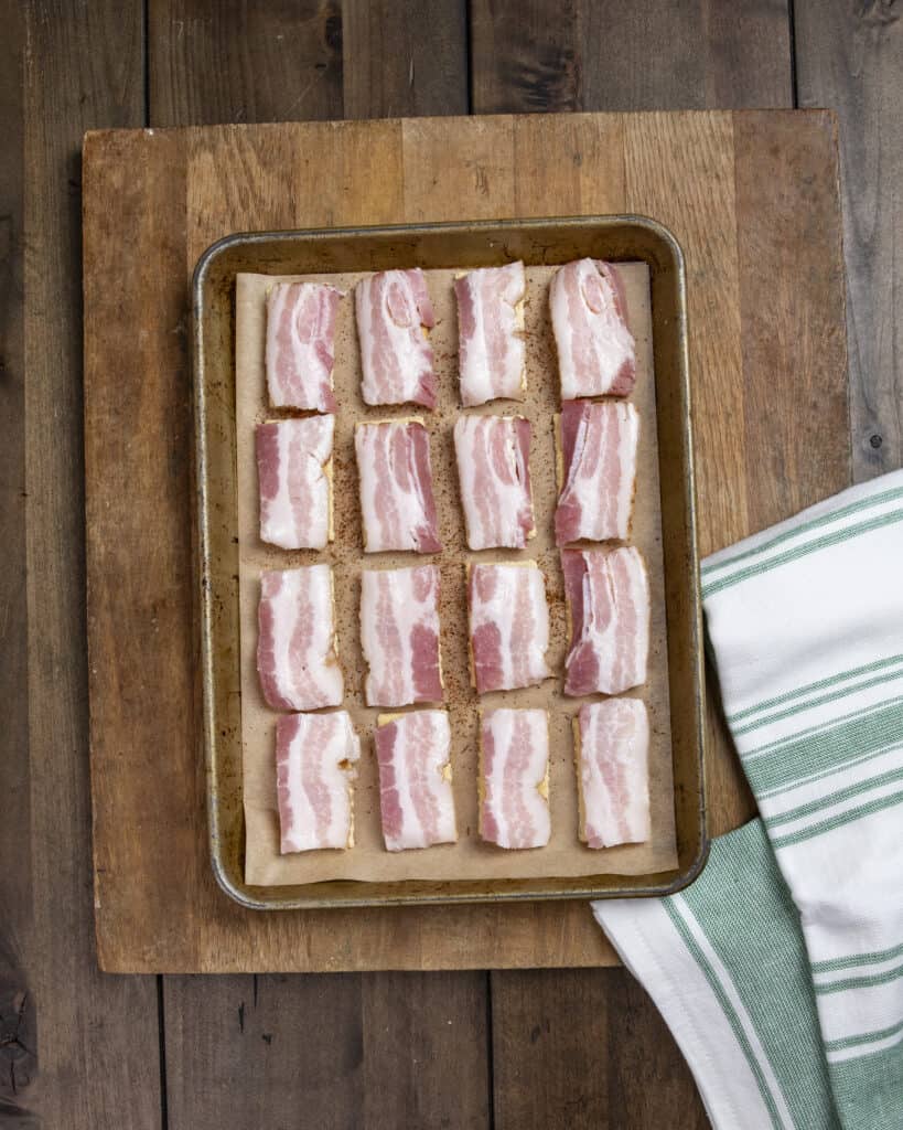 - Place crackers onto your smoker or in your oven at 350°F for 25-30 minutes until the bacon is cooked through and to your preferred doneness.