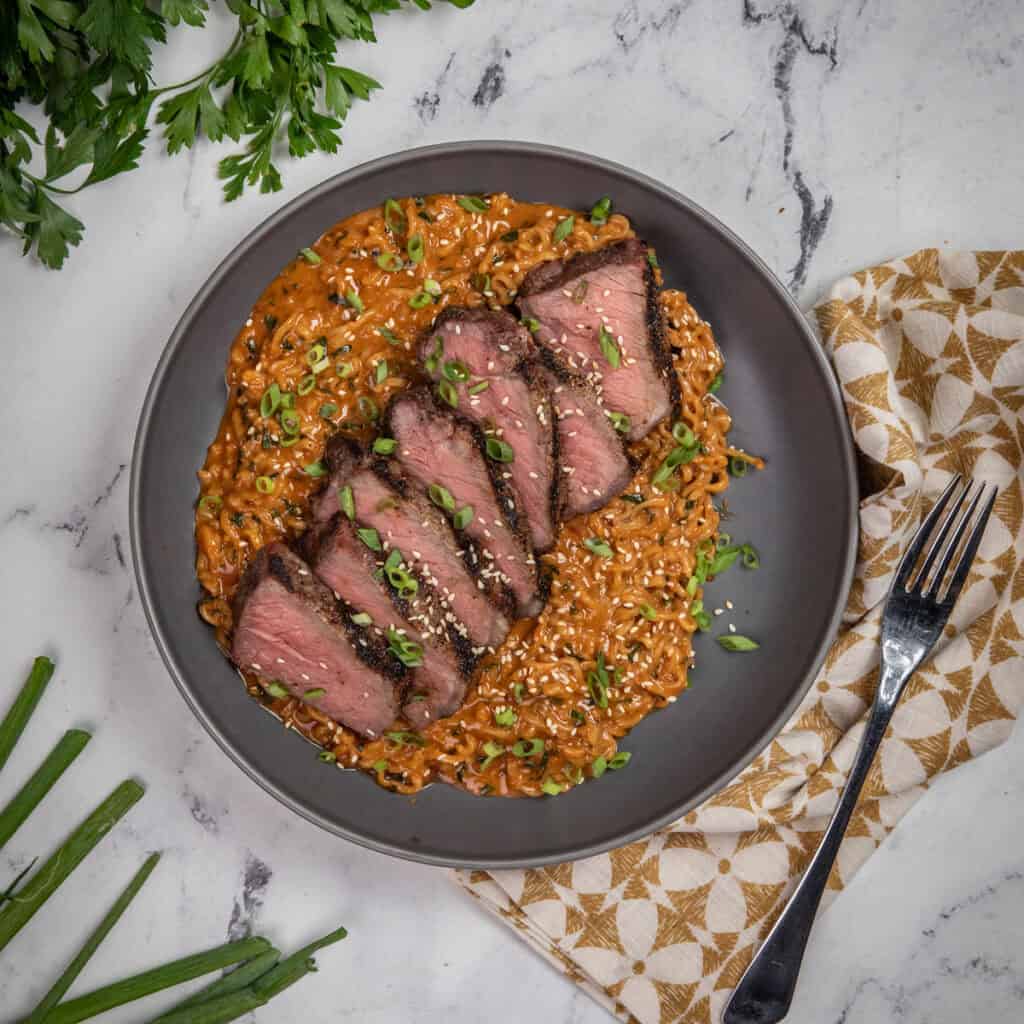 - Creamy spicy garlic noodles with Steak