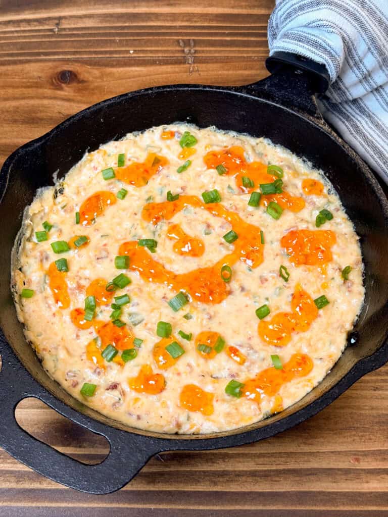 - Finish by warming up the remaining pepper jelly and drizzling it on top of the dip along with the remaining green onions for garnish.